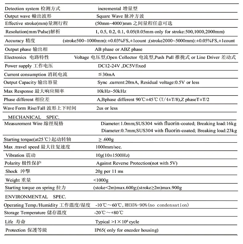 MPS-M 拉線編碼器拉繩尺的參數(shù)資料: