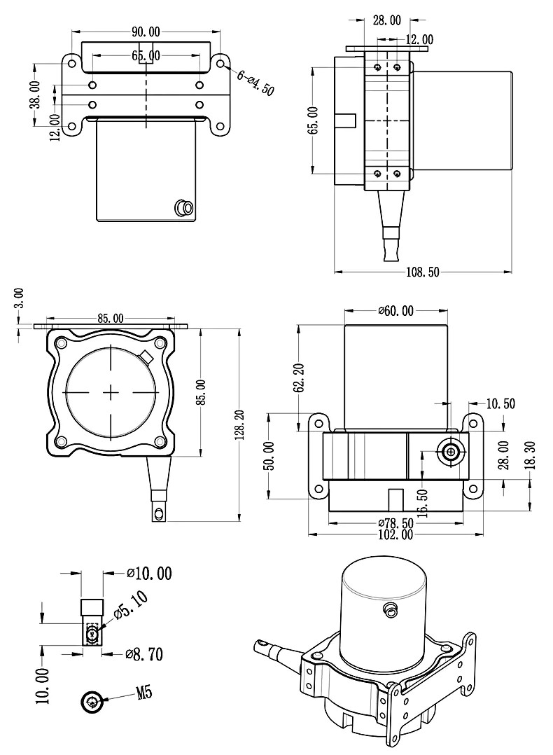 1,利用底部4個固定螺絲孔,依現場及機器安裝空間設施需要,直接安裝或另加保護或其他機械使用。