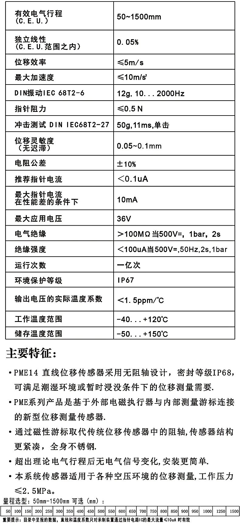 PME14磁阻式防水型直線位移傳感器技術參數及主要特征: