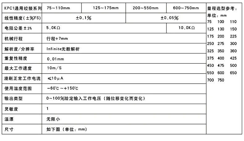 KPC1兩端魚眼鉸接式電子尺(別名:電阻尺,電位器,位移傳感器)原理:電位計原理,所有傳感器為位置測量型,用于調節系統(控制系統)和測量系統中,對位移和長度進行直接測量,輸出直流電壓信號,也可以通過內置或者外置的V/A變送模塊講信號轉換成標準的0-5V、0-10V或者4-20mA直流信號,也可以遠距離傳輸控制要求。KPC1兩端魚眼鉸接式電子尺(別名:電阻尺,電位器,位移傳感器)輸出位移變化:0-100%給定輸入工作電壓(隨位移變化而變化)。