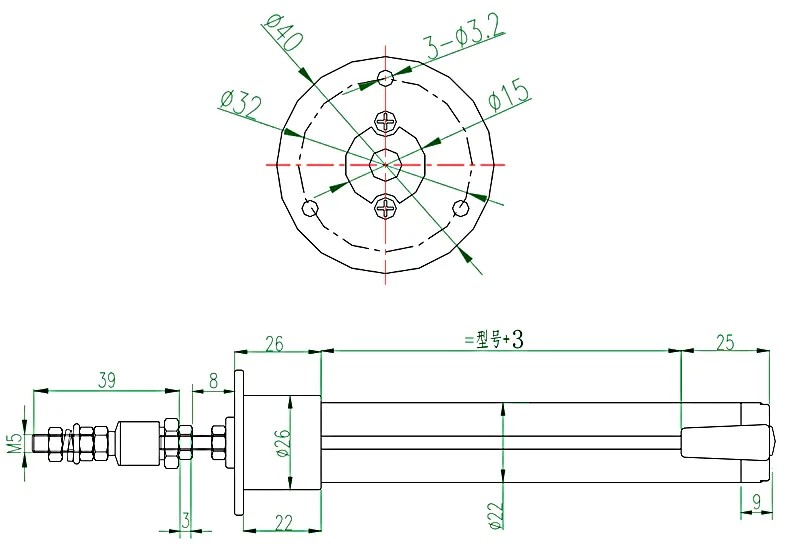 KPF法蘭式位移傳感器的參數及安裝尺寸圖: