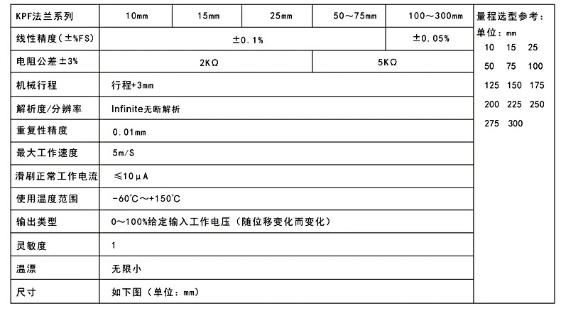 KPF法蘭式位移傳感器(別名:電子尺,電阻尺,電位器,位移傳感器)原理:電位計原理,所有傳感器為位置測量型,用于調節系統(控制系統)和測量系統中,對位移和長度進行直接測量,輸出直流電壓信號,也可以通過內置或者外置的V/A變送模塊將信號轉換成標準的0-5V、0-10V或者4-20mA直流信號,也可以遠距離傳輸控制要求。KPF法蘭式位移傳感器(別名:電子尺,,電阻尺,電位器,位移傳感器)輸出位移變化:0-100%給定輸入工作電壓(隨位移變化而變化)。