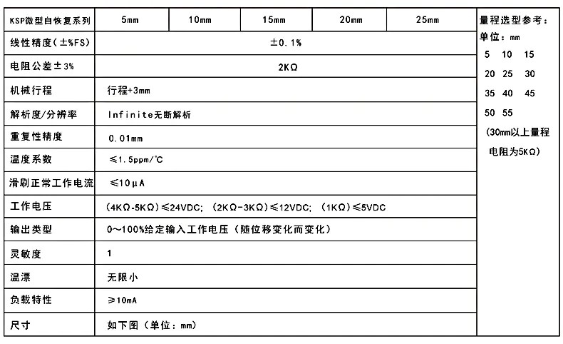 KSP圓管微型自復位式位移傳感器(別名:電子尺,電阻尺,電位器,位移傳感器)原理:電位計原理,所有傳感器為位置測量型,用于調節系統(控制系統)和測量系統中,對位移和長度進行直接測量,輸出直流電壓信號,也可以通過內置或者外置的V/A變送模塊將信號轉換成標準的0-5V、0-10V或者4-20mA直流信號,也可以遠距離傳輸控制要求。KSP圓管微型自復位式位移傳感器(別名:電子尺,電阻尺,電位器,位移傳感器)輸出位移變化:0-100%給定輸入工作電壓(隨位移變化而變化)。