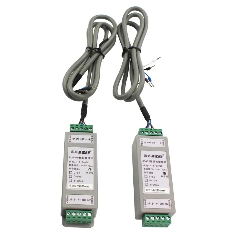米朗數字模擬轉換模塊是配合米朗磁致伸縮位移傳感器等RS485數字信號輸出的產品使用。傳感器把實時位移信號用RS485數字信號格式傳送到安裝在電控箱內的該模塊進行解碼。然后轉化成0-10V電壓等模擬量信號,再傳送到控制器的標準模擬輸入。