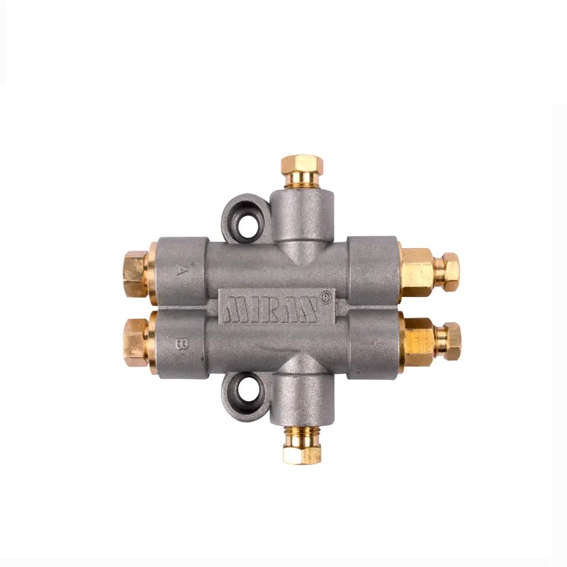 工作原理 A:計量活塞動作行程 B :傘形雙向閥動作行程見上圖,從潤滑泵壓送的油從主管A注入,并將傘形雙向閥B向推開流入,通過通路C壓送活塞室到F內。受壓力油作用下計量活塞向下動作彈簧G被壓縮蓄油,從而進行計量蓄油,當主管A內油壓被釋放〈即卸壓〉,傘形閥B因壓力差而動作,同時開啟吐出口E,于是活室內計量蓄油通過吐出口E送入油管H而將油輸送到潤滑點, 信號銷I當計量蓄油時突出.而供油給潤滑點時縮回,從而確認分配動作完成情況。 A: metering piston action schedule B: the action trip of the umbrella type two-way valve is shown in the figure above. The oil from the lubrication pump is injectedfrom the director A, and the umbrella-type two-way valve B is pushed open. Push the piston chamber to F through the channel C.The piston moves downward under the action of pressure oil.The spring G is compressed.Thus the measurement of oil storage.When the oil pressure is released in charge of A(the discharge pressure). The umbrella valve B moves with pressure difference. At the same time, it opens the outlet E, so the living room measures the oil storage.The oil is transported to the lubrication point by outlet E to the pipe H, and the signal pin I is prominent when measuring the oil storage. When the oil is supplied to the lubrication point, it is retracted to confirm the completion of the distribution.
