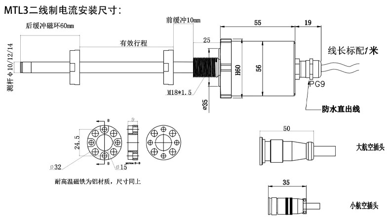 低功耗(二線制)磁致伸縮位移傳感器安裝尺寸: