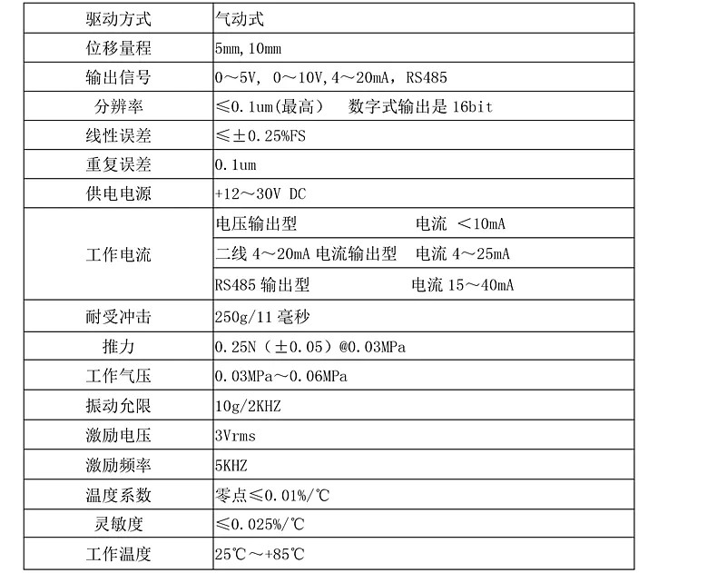 氣動式位移傳感器具有優良的性能,適用于質量控制和計量應用中的高精度、高重復性的測量。測頭采用高硬度的耐磨材料氮化硅陶瓷球,測軸移動部分采用精密導軌。氣動式位移傳感器外配變送器可輸出標準的直流信號,采用方便的單電源+12~30V DC供電,電子電路密封在304不銹鋼金屬管內,可以在潮濕和灰塵等惡劣環境中工作。輸出信號為標準的可被計算機或PLC使用的0-5V,0-10V,4-20mA或RS485輸出。