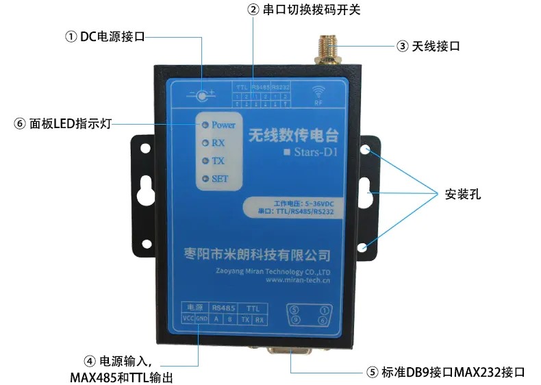 ⑥: 面板LED指示燈,POWER電源指示燈,上電就亮。數據收發RX,TX指示燈。無線收到數據RX閃爍,無線發送數據TX閃爍。SET接口設置燈紅藍都亮表示MAX485接口,紅燈亮表示TTL接口,藍燈亮表示MAX232接口。