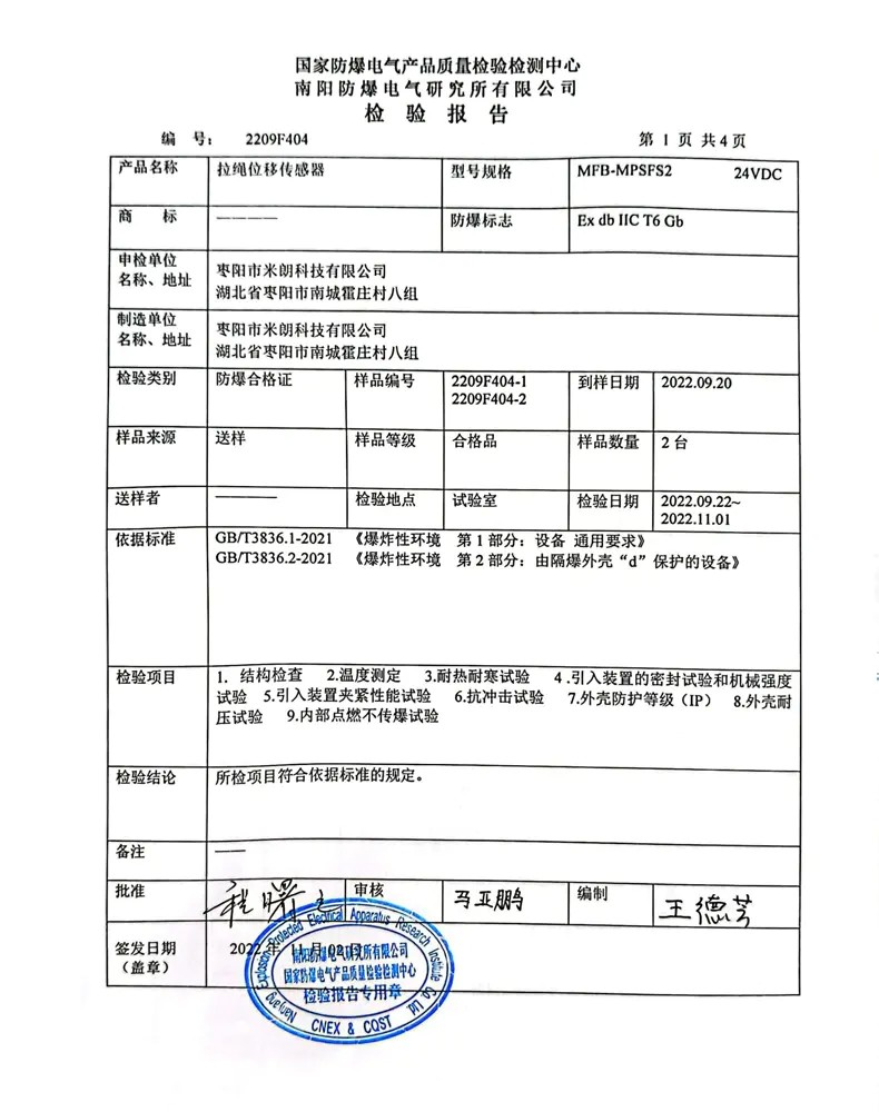 絕 對值防水防爆型拉繩/線式位移傳感器證書適用于以下位移傳感器:MFB-MPSFS2-S-EX(量程100-1300mm),MFB-MPSFS2-M-EX(量程1000-4000mm),MFB-MPSFS2-L-EX(量程4500-10000mm),MFB-MPSFS2-XL-EX(量程11000-35000mm)。