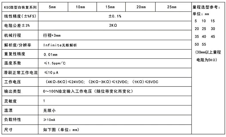 KSC方管微型自復位式位移傳感器的參數說明:
