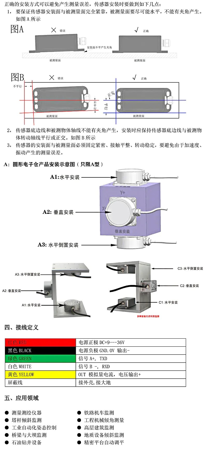 測量測繪儀器,鐵路機車監測,塔桿傾斜監測,工程機械傾角測量,工業自動化姿態控制,高層建筑監測,橋梁與大壩監測,地質設備傾斜監測,石油鉆井設備,精密平臺。