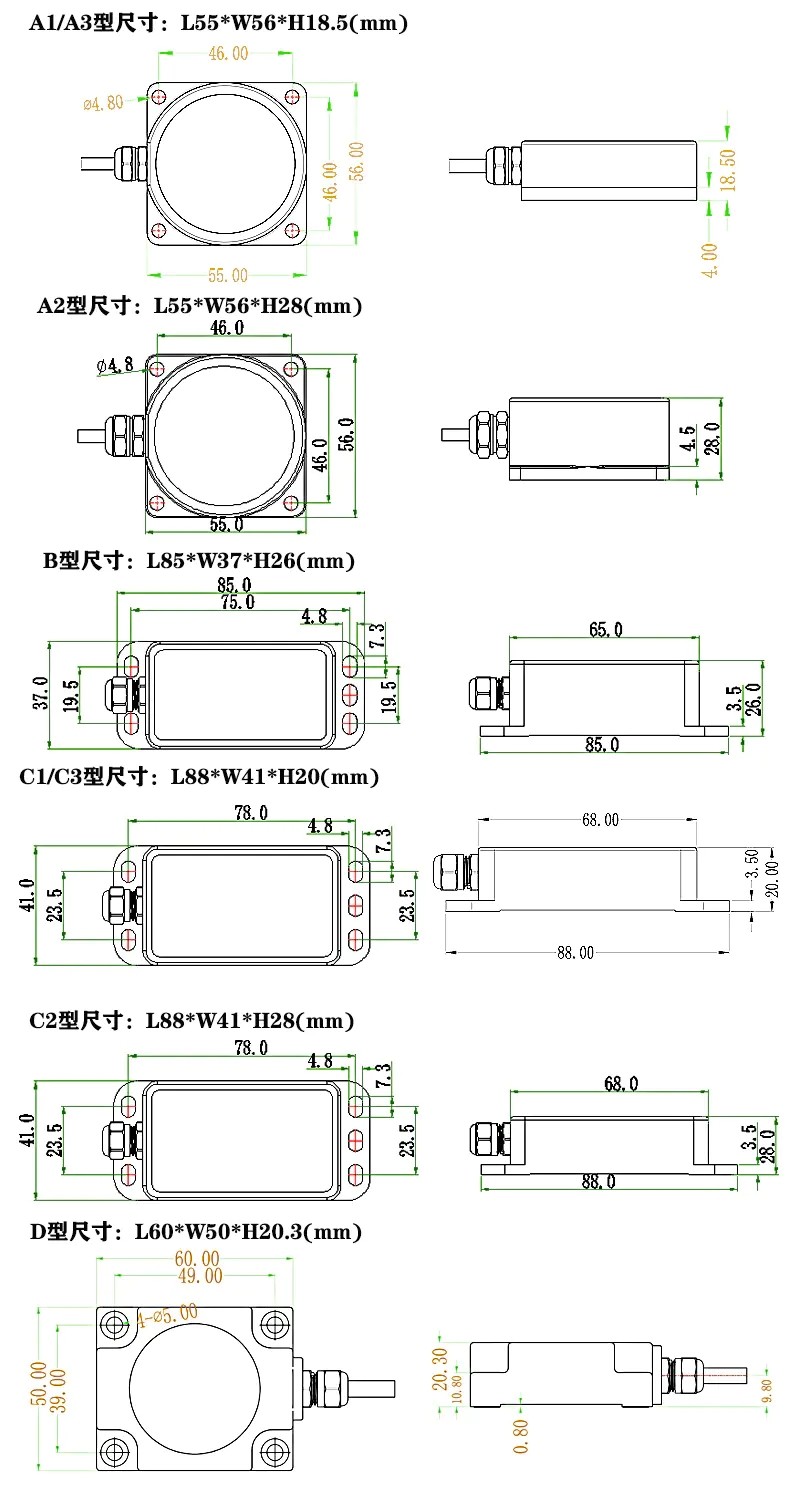 四、傾角傳感器的安裝尺寸: