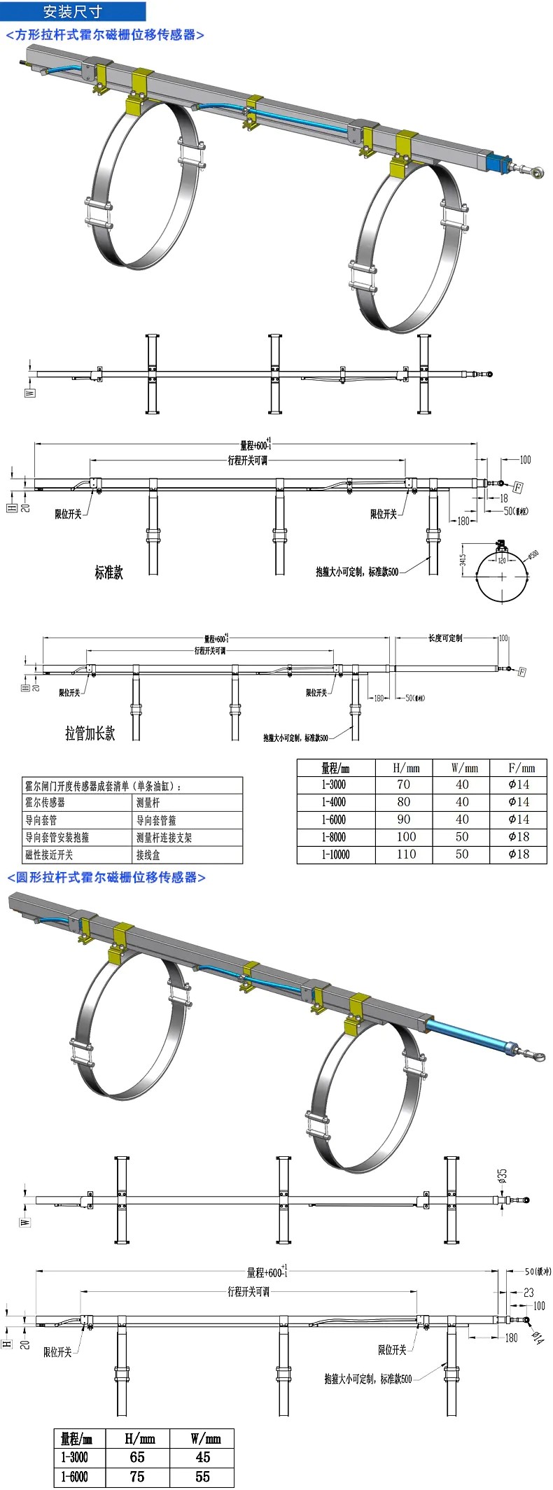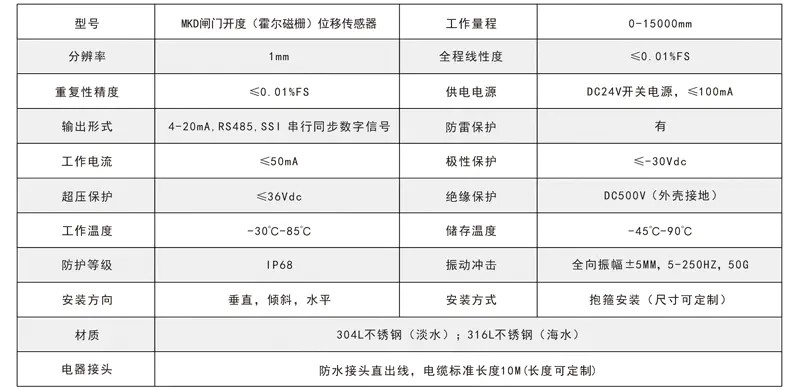 三、閘門開度(霍爾磁柵)位移傳感器技術參數及安裝尺寸:
