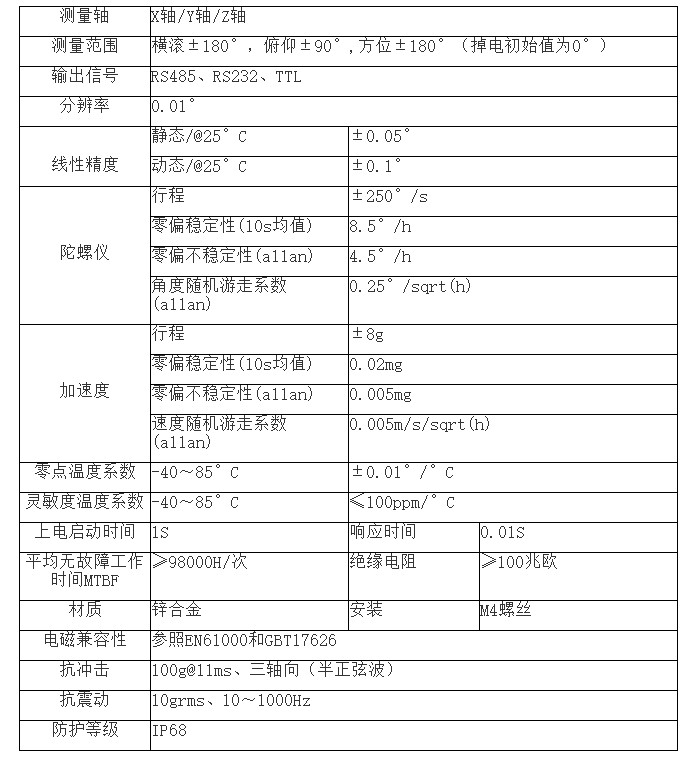 三、六軸(姿態(tài))傾角(動(dòng)態(tài))傳感器技術(shù)參數(shù):