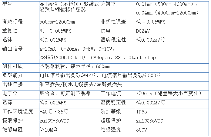 二、MR1不銹鋼軟纜式磁致伸縮位移傳感器技術(shù)參數(shù):