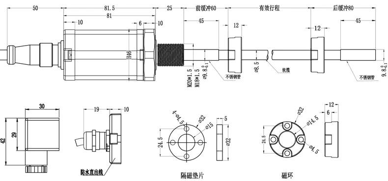 五、MR1不銹鋼軟纜式磁致伸縮位移傳感器安裝尺寸圖: