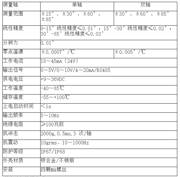 二、傾角傳感器技術參數: