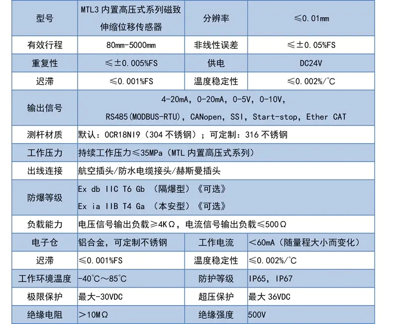 MTL3磁致伸縮位移傳感器標準參數: