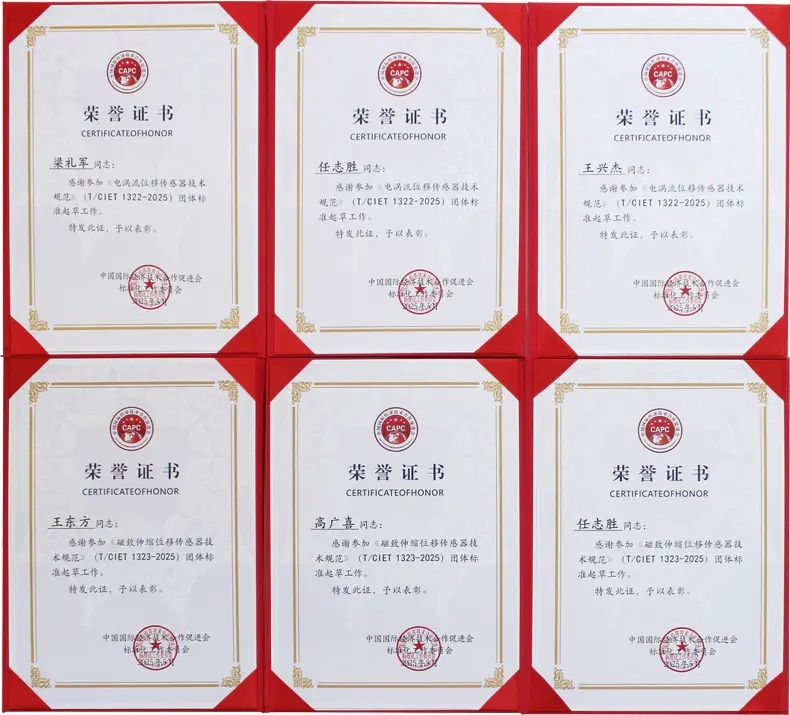 磁致伸縮位移傳感器標準起草榮譽證書
